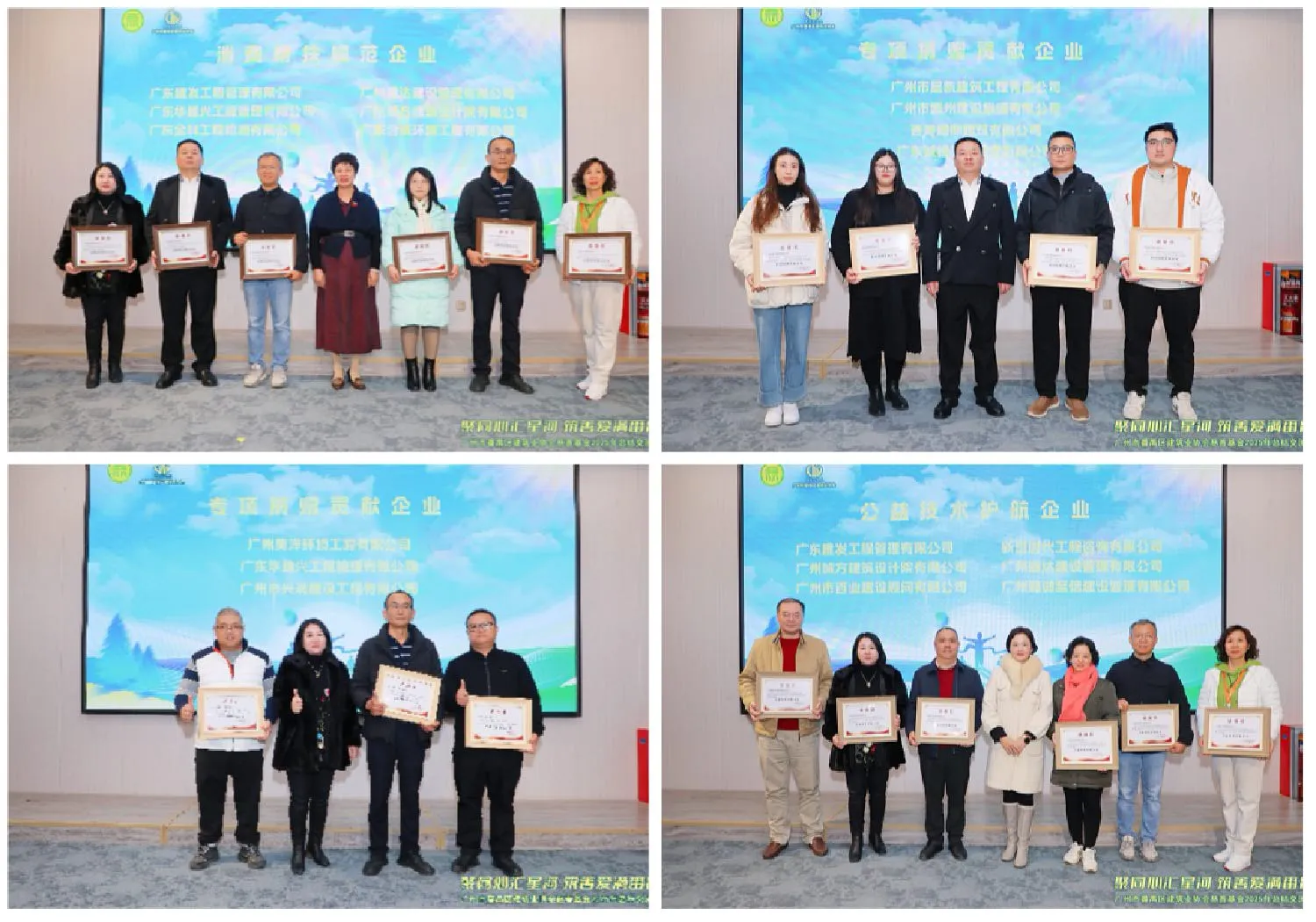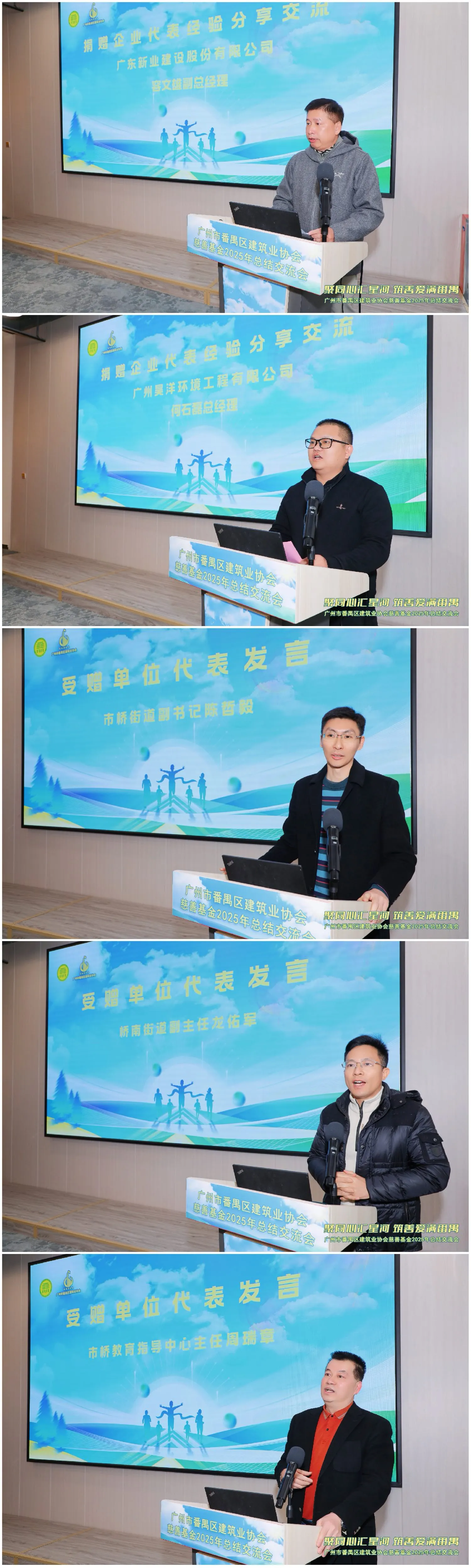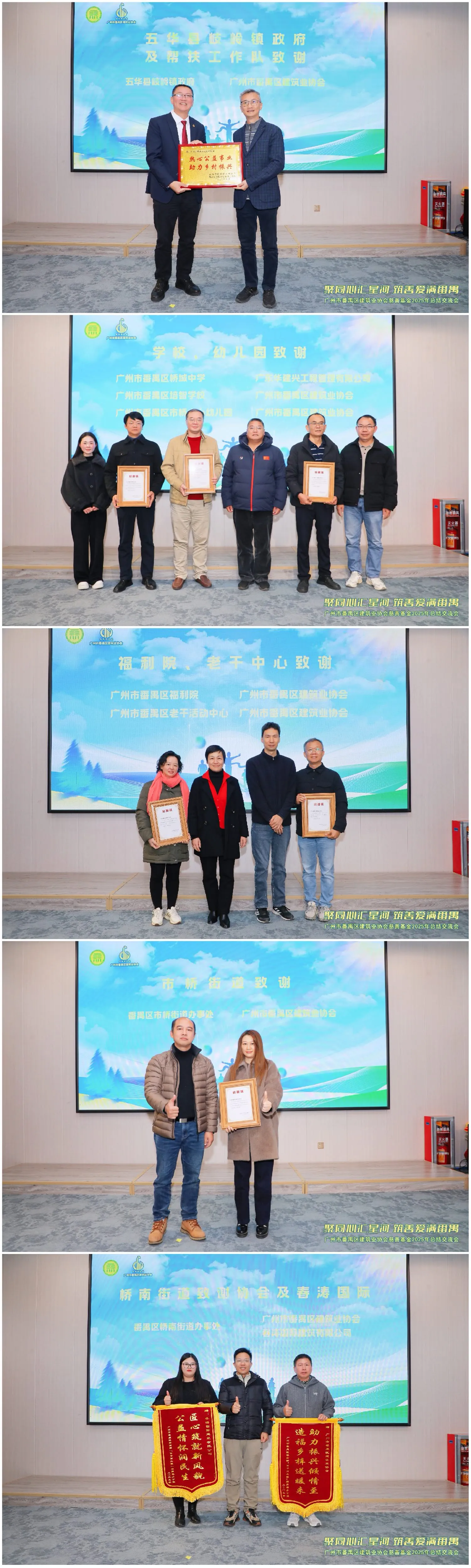 尤为动人的是受赠单位的回馈之情。五华县岐岭镇政府及帮扶工作队通过视频展示了由协会慈善基金援建的龙水村路灯项目,并现场致谢;桥城中学、培智学校、市桥中心幼儿园、区福利院、老干中心、市桥街道、桥南街道等单位代表先后上台,向协会及相关捐赠企业颁发感谢状或赠送锦旗。一面面锦旗,一声声感谢,是对番禺建筑人慈善之心最直接、最真挚的肯定。