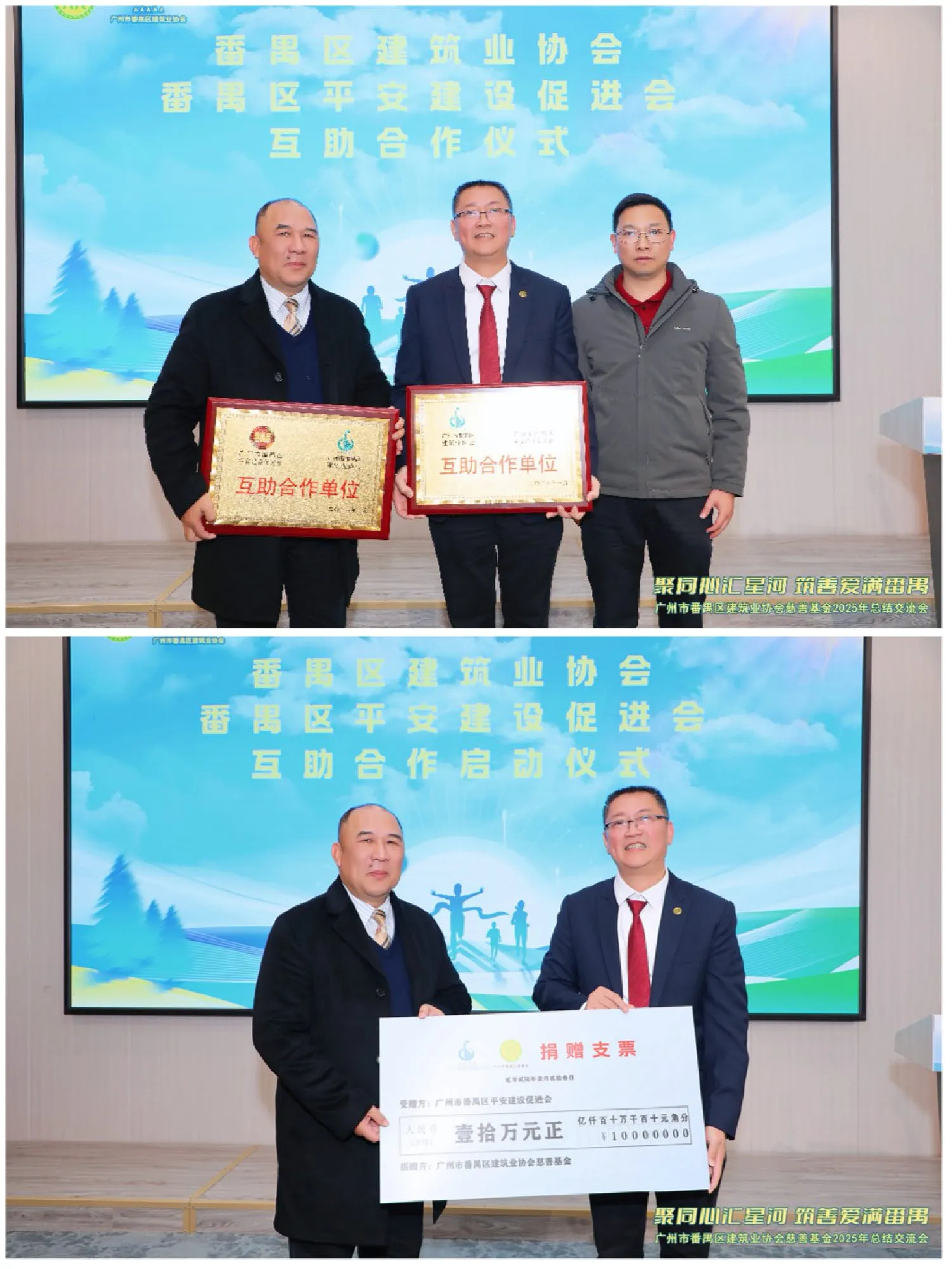 会上举行了一场意义深远的仪式——番禺区建筑业协会与区平安建设促进会互相交换了互助合作牌匾。蒲建峰会长代表协会向区平安建设促进会冯毅会长捐赠十万元支票,支持购买平安建设保障设备(对讲机) 项目,用于最小应急单元通讯和调度。这次合作标志着双方将在公益道路上携手并进,共同助力区域和谐稳定与社会治理。
