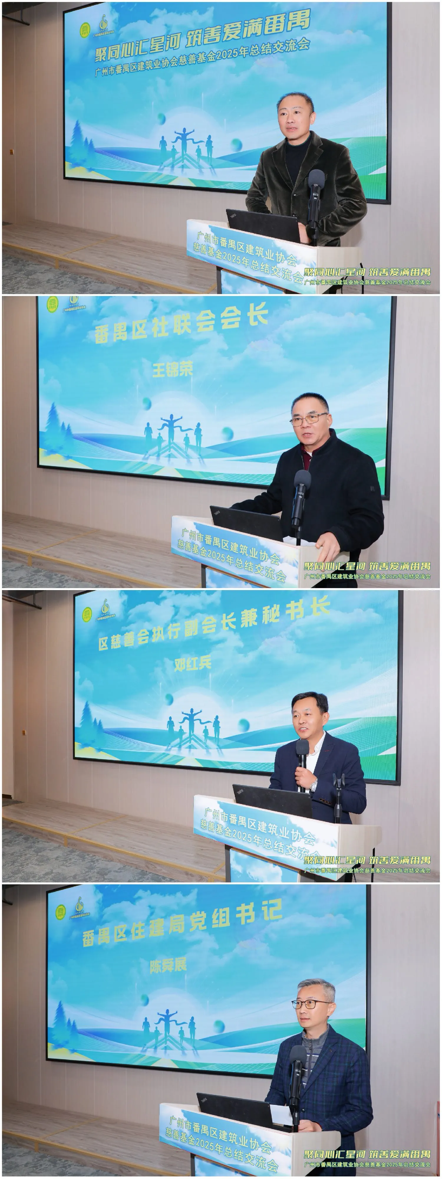 区委社工部部长何国仪、区社联会会长王锦荣、区慈善会执行副会长兼秘书长邓红兵、区住建局党组书记陈舜展先后发表讲话。各位领导高度赞扬了区建筑业协会及其会员企业长期以来在慈善公益领域的突出贡献,认为这不仅体现了建筑行业的深厚情怀,更是助力番禺高质量发展、建设和美社区的重要力量。他们鼓励协会继续凝聚行业爱心,规范高效运作基金,打造更具影响力的慈善品牌。