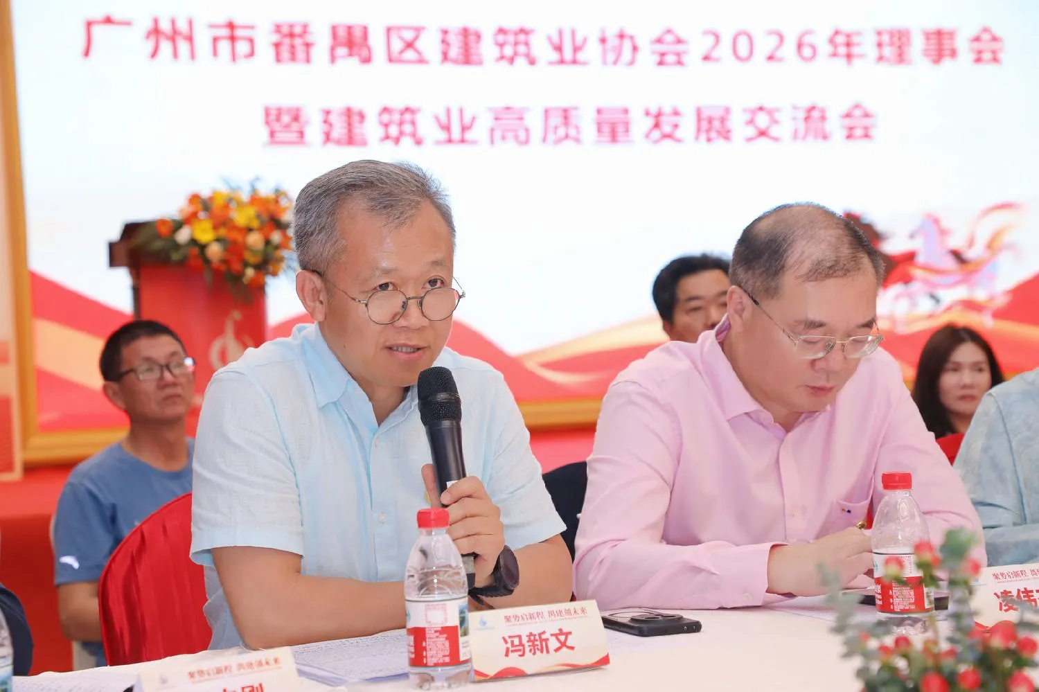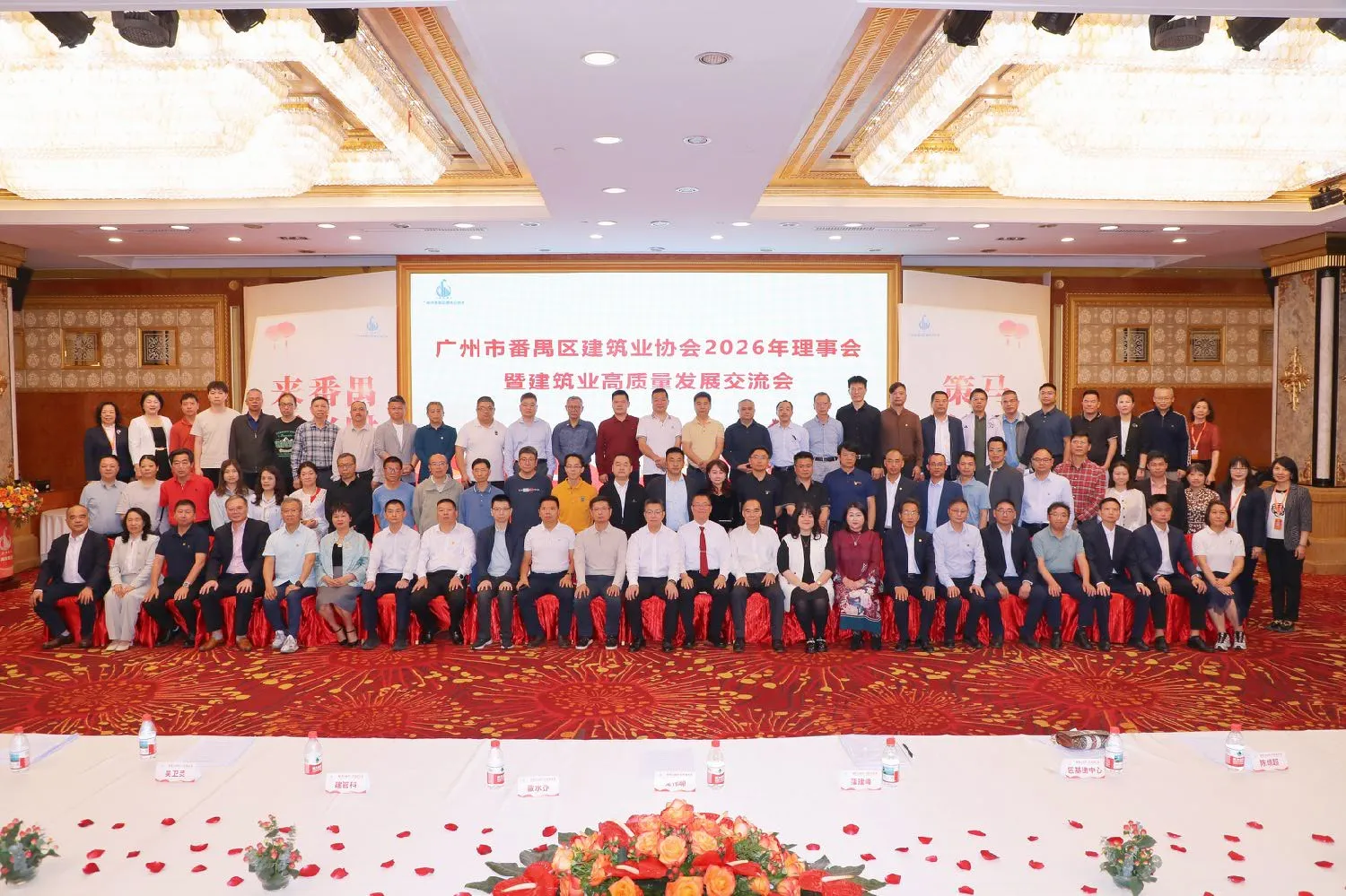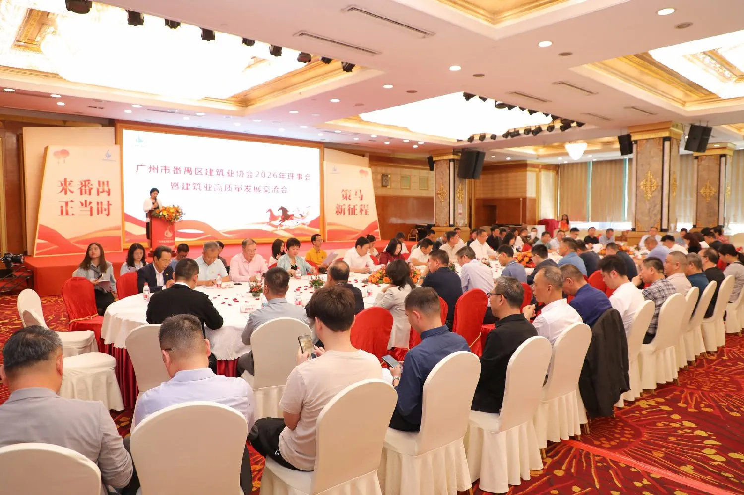 3月18日下午,广州市番禺区建筑业协会在番禺宾馆富华宫二楼成功召开2026年理事会暨建筑业高质量发展企业家交流会,以及第七届第二次会员大会。本次大会以“聚势启新程 禺建创未来”为主题,区工商联、区住建局、区民政局等相关部门负责人与协会全体会员单位代表齐聚一堂,共商行业发展大计,共绘高质量发展蓝图。