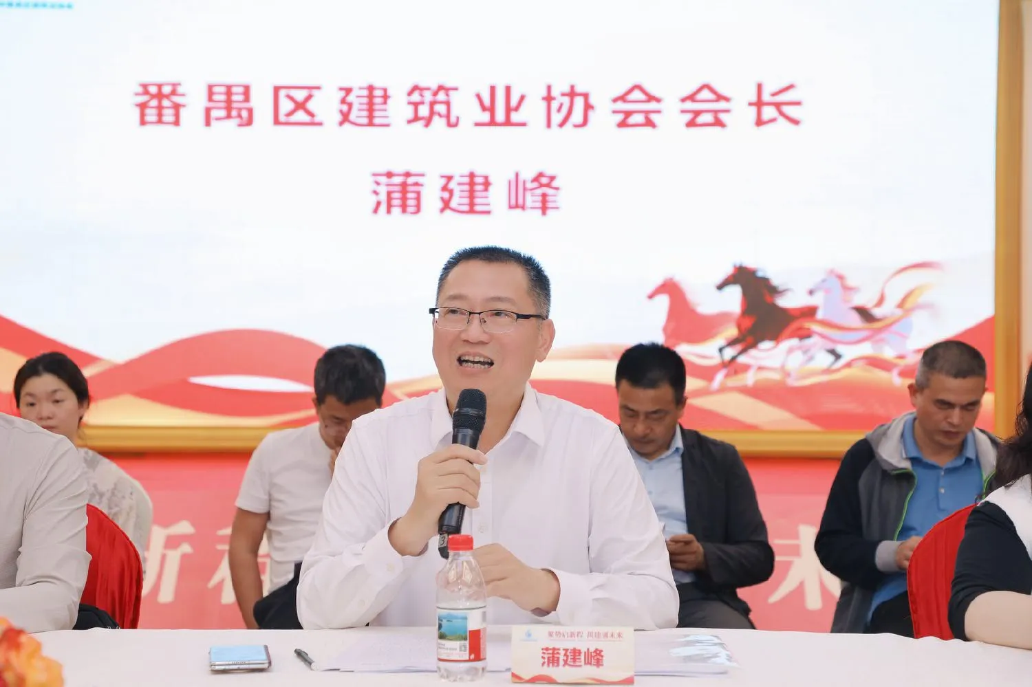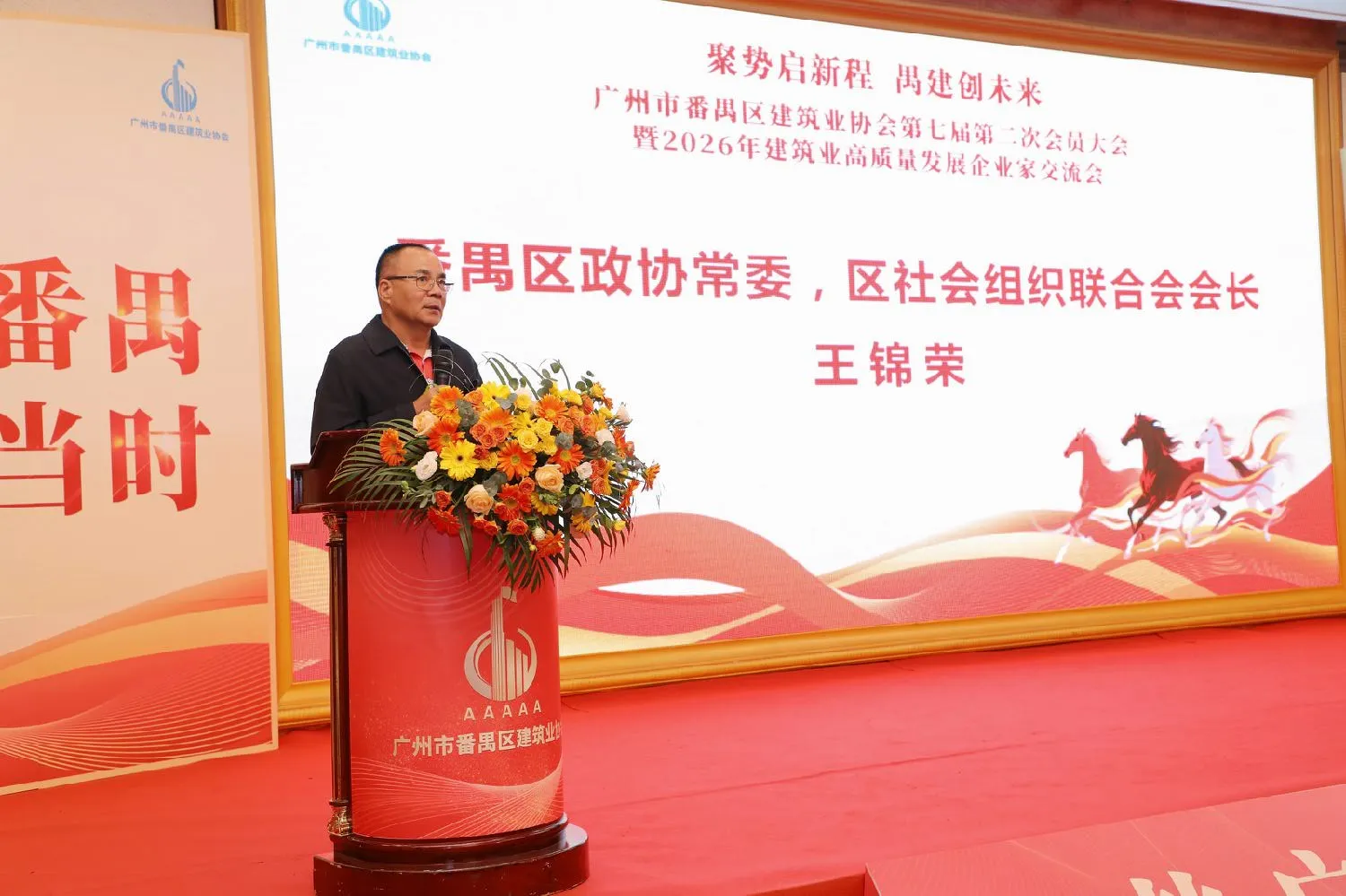 区社联会会长王锦荣及区住建局副局长庞伟聪在讲话中高度评价了区建筑业协会过去一年的工作。他们指出,协会不仅是政府与企业的桥梁纽带,更是推动行业转型升级的重要力量。希望协会继续发挥引领作用,引导会员企业积极适应新发展格局,紧抓政策机遇,在“好房子”建设、绿色建材应用及招标投标改革中先行先试,为番禺区城市建设和经济社会高质量发展贡献更多“禺建”力量。